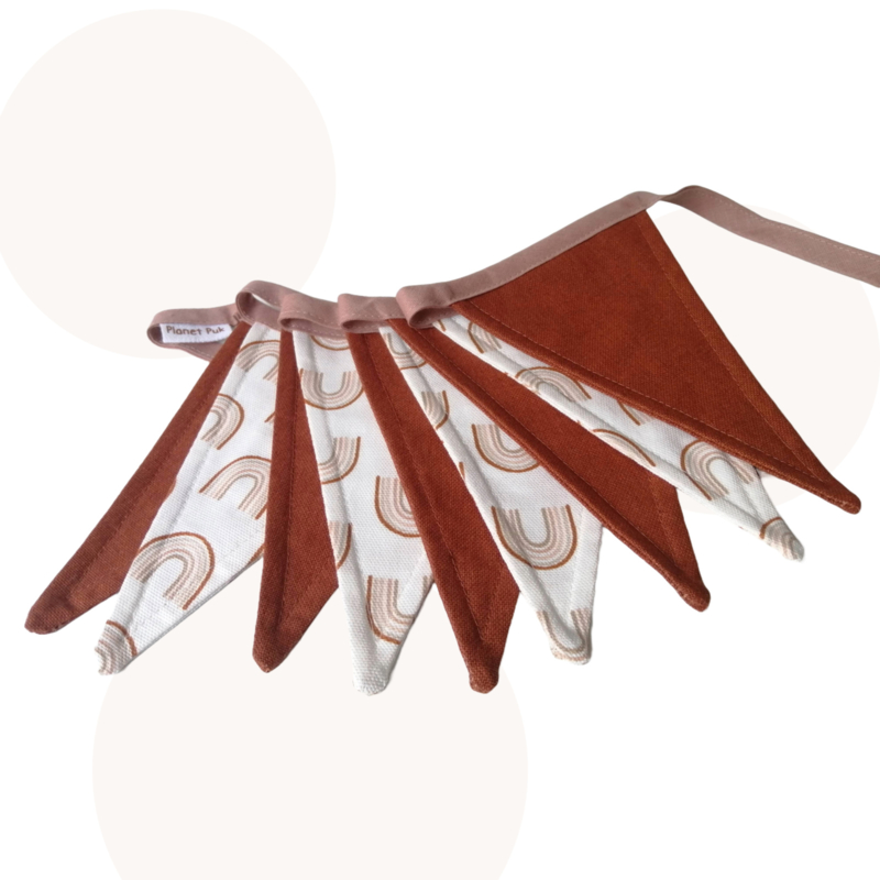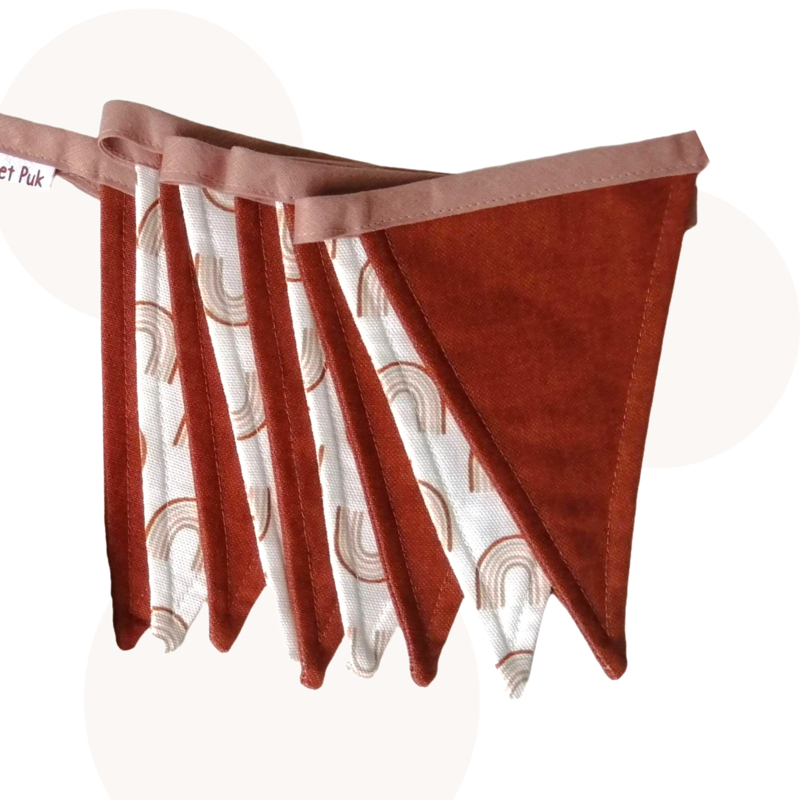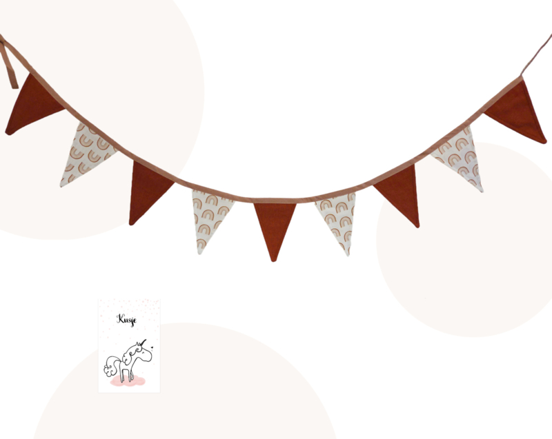 Vlaggenlijn: 9 vlaggetjes, ca. 2 meter lang, kleuren: roestbruin en wit met regenboogjes, band in oudroze