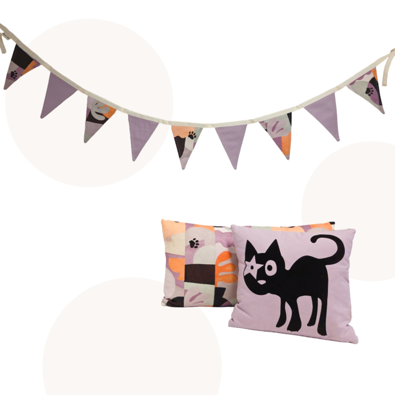 - 9 vlaggetjes: 4 x lila, 5 x fantasieprint en enkele kattenpootjes