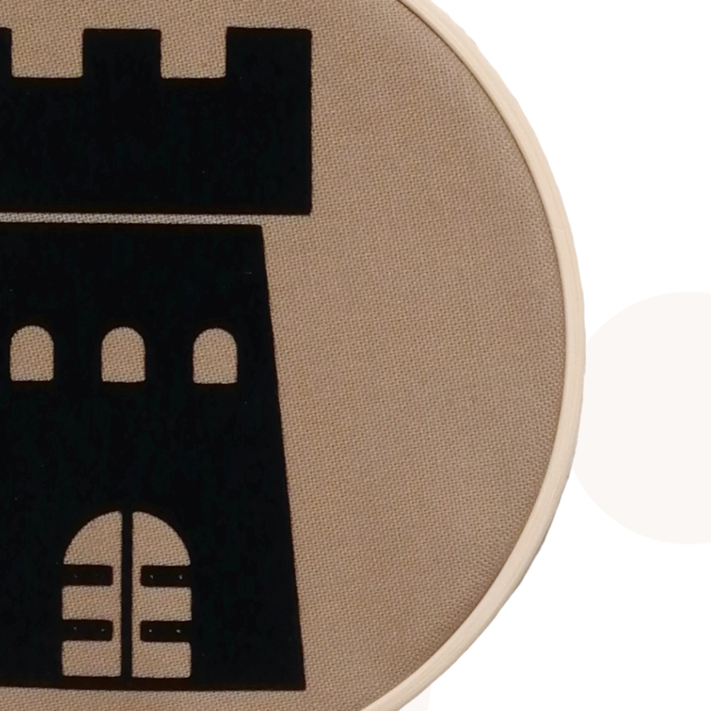 Deze ronde wandhanger met krachtig kasteel-silhouet brengt een warme, middeleeuwse sfeer in de baby- of kinderkamer. Het ontwerp is stoer en minimalistisch tegelijk, waardoor het perfect past in een ridderkamer, draakjesthema of rustige Japandi setting.