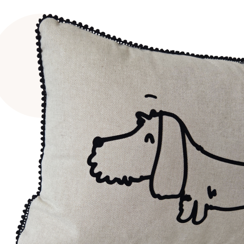 Het beige linnenlook kussen heeft een rustige, natuurlijke uitstraling en is rondom afgewerkt met kleine zwarte mini pompons. Dit speelse detail vormt een mooi contrast met de zwarte illustratie van Guus.