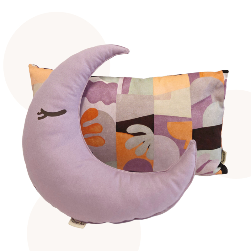 Deze lila maan doet zijn ogen dicht en droomt mooie dromen, overdag én in de nacht. Droom je lekker mee? Een speels en fantasievol kussen dat helemaal thuis is in Hoshi’s Droomwereld.